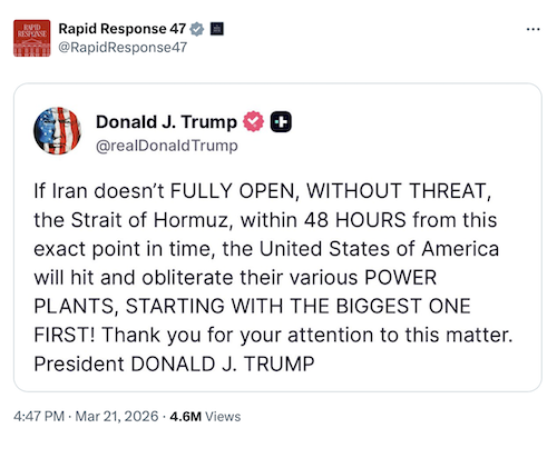 Either they fully open the Strait of Hormuz within 48 hours, or the U.S. military will destroy their power grid…